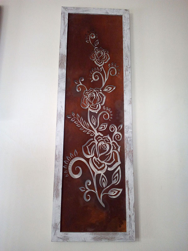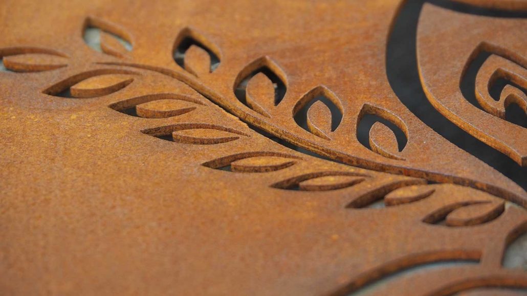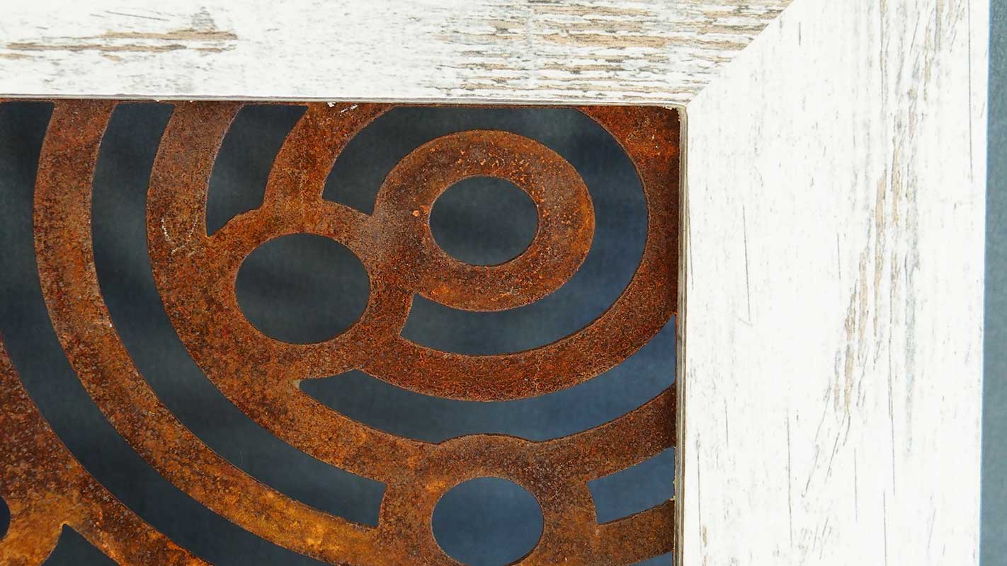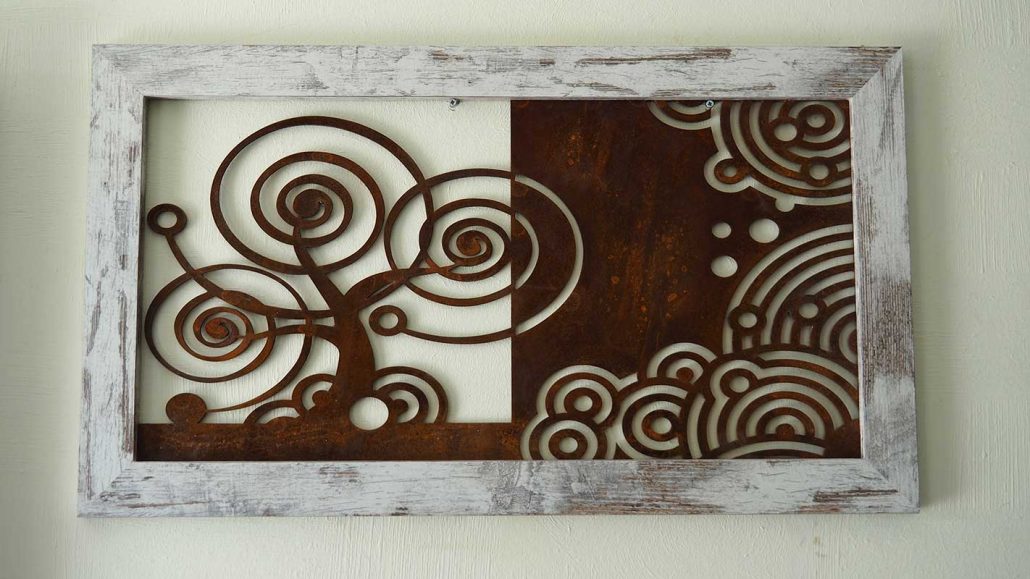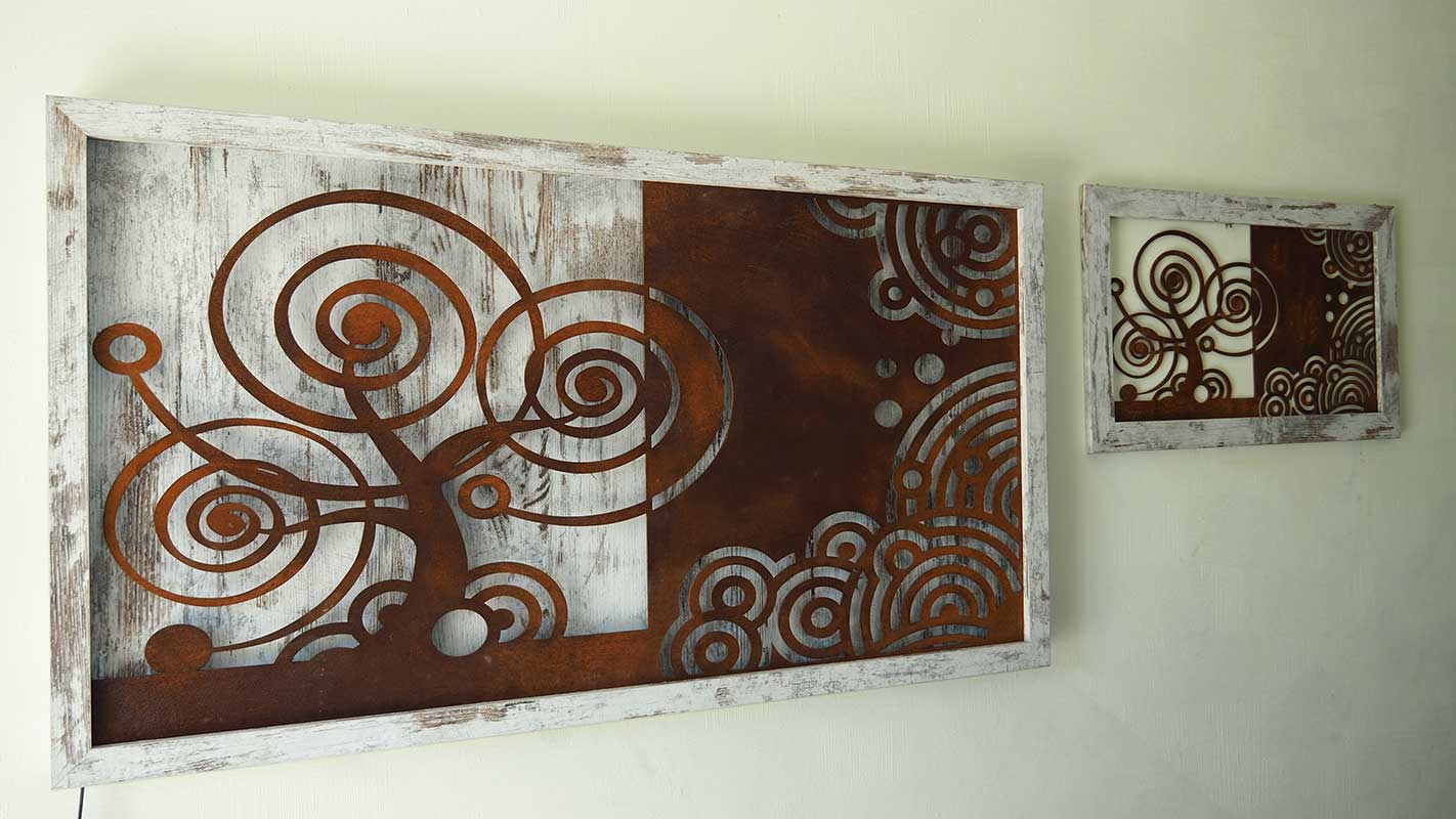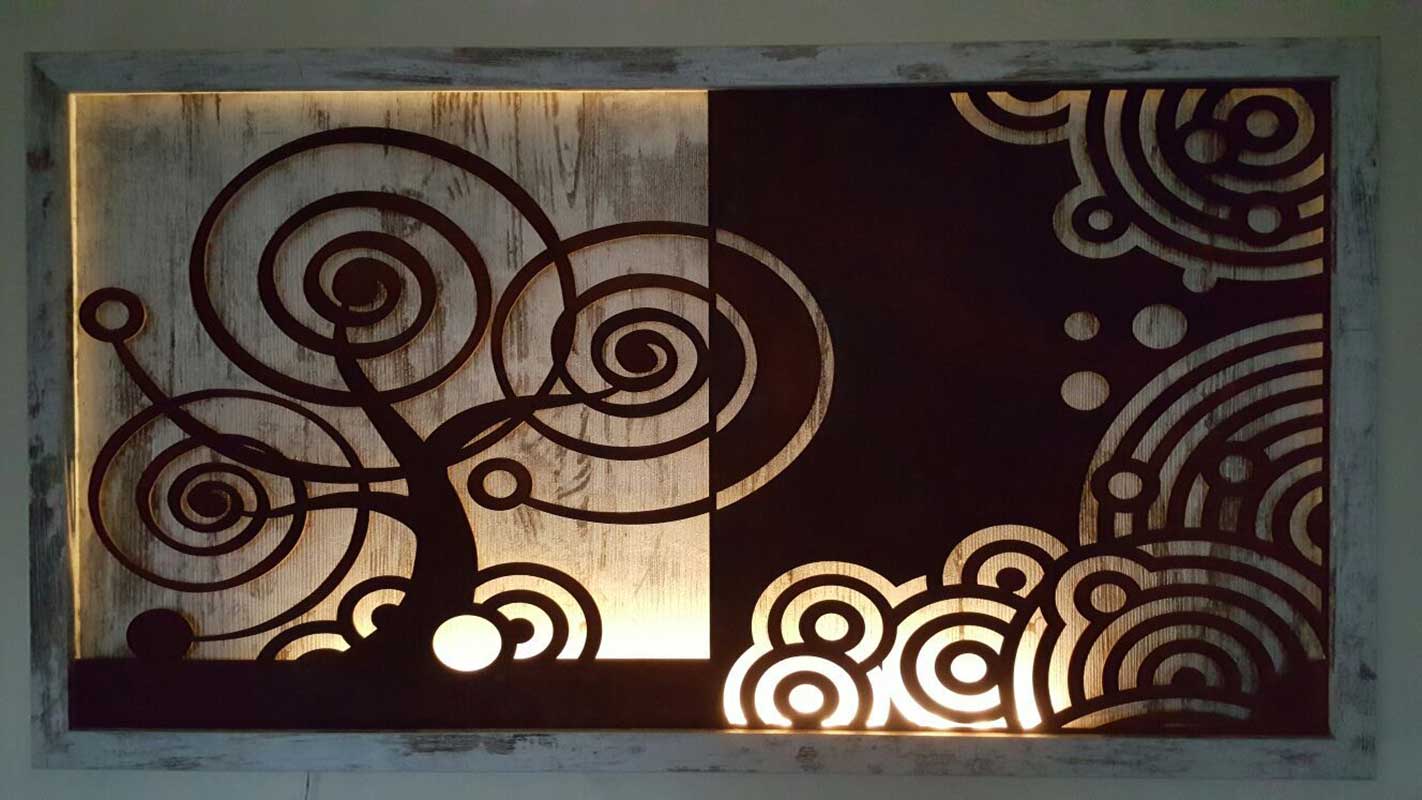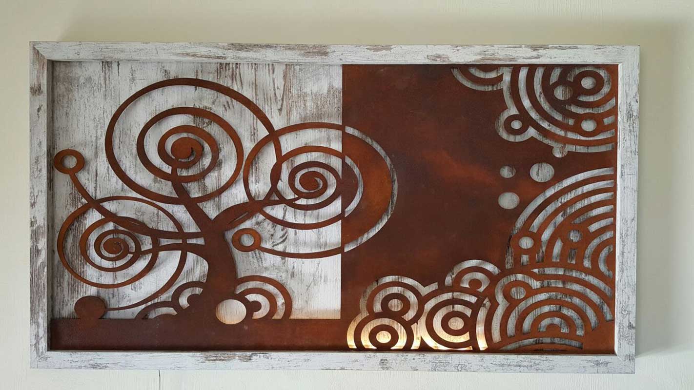Il prodotto è stato fatto interamente presso la nostra azienda dalla progettazione alla lavorazione. Dopo aver praticato sulla lastra di CORTEN il disegno scelto, la stessa viene esposta all’esterno per dare inizio al processo di ossidazione. Successivamente viene posizionata all’interno della cornice in legno dove sono inseriti degli appositi led luminosi.